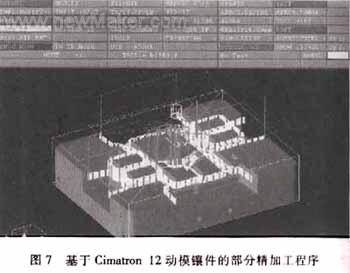 如圖6所示,需要CNC加工的模具零件上要有定模鑲件12、動(dòng)模鑲件2、定模板17、動(dòng)模板18。定模鑲件和動(dòng)模鑲件的加工是基本相同的,是方管外形的主要成型模具零件,粗坯加工好后,進(jìn)行CNC加工,留量約為0.66-0.8mm(材料為瑞典8407模具鋼),之后淬火,返回后進(jìn)行精加工,CNC加工至尺寸,待試模合格后熏化處理;定模板和動(dòng)模板的加工是基本相同的,它們是主要的模具結(jié)構(gòu)零件。在這里需要指出的是通過(guò)Pro/E模具設(shè)計(jì)模塊設(shè)計(jì)出的零件模型.可以直接用CAM軟件Cimatron 12編程,再用于CNC加工,圖7是基于Cimatron 12動(dòng)模鑲件的部分加工程序。