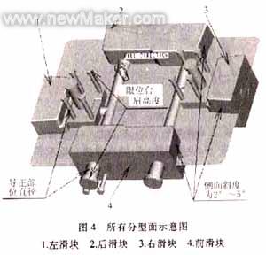 由圖3可知,產(chǎn)品模型帶有6個(gè)小孔的一面向下布置,也就是說(shuō),將采成型這6個(gè)小孔的型芯位于動(dòng)模一側(cè)。實(shí)際應(yīng)用證明,這樣的布置是比較合理的:因?yàn)槌尚透鞣N孔的型芯是易磨損件.在模具使用一段時(shí)期后,需要更換型芯,而處于動(dòng)模一側(cè)的型芯較處于定模一側(cè)的型芯更容易更換和調(diào)整,互換速度快。所以,在產(chǎn)品模型布置時(shí)應(yīng)盡可能將較多的孔置于動(dòng)模一側(cè)。