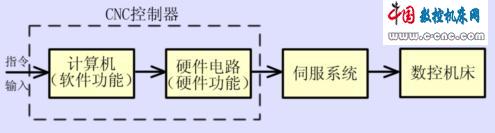 由上述定義可知,CNC系統與傳統NC系統的區別在于:CNC系統附加一個計算機作為控制器的一部分,其組成框圖如圖3-1所示。圖中的計算機接收各種輸入信息(如鍵盤、面板等輸入的指令信息),執行各種控制功能(如插補計算、運行管理等等)。而硬件電路完成其他一些控制操作。