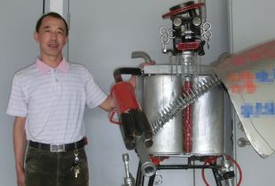 當日上午,記者來到該汽配城二樓,看到一個“荷槍實彈”的機器人“威武”地站在大廳門口。經(jīng)聯(lián)系,記者找到了機器人的制作者王樹生。王樹生說,他今年5月去北京時,看到了一個用汽車配件制成的“大黃蜂”深受啟發(fā)。回來后,他便和徒弟琢磨著利用汽修廠廢棄的零部件制作一個機器人。王樹生農(nóng)民出身,自己開辦了一家汽修廠和一個汽車配件門店。出于對機械的興趣愛好,經(jīng)過10多天的努力,一個身高1.8米,重200多斤的機器人終于誕生了。汽車的剎車盤成了機器人的禮帽,凸鏡成了眼睛,消音器成了身軀,下肢臂成了腿腳……6月7日,經(jīng)與物業(yè)協(xié)商,王樹生將自己制作的第一個機器人擺放在了汽配城內(nèi)。“最吸引小孩子們,還有一些人和它合影,讓我覺得沒白費功夫。”王樹生說。他有一個夢想,就是做一個更大的機器人,擺放在清水河岸邊,供市民參觀。