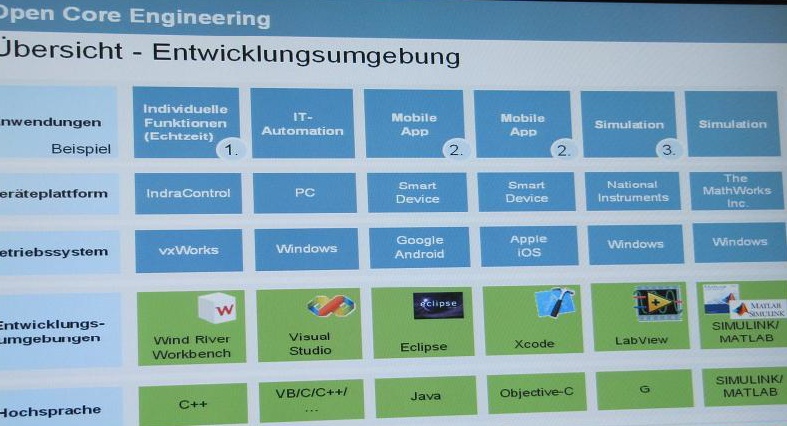 力士樂公司推出了開放核心(圖 3),即工程師可以用各種高級編程語言,通過各種編程工具,從各類硬件的各種操作系統出發,調用核心的控制功能,完成各種應用。演示模型是一個平板電腦,通過無線網絡(W-LAN),控制一個六自由度的平臺,隨平板電腦擺動。