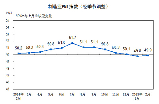 2015年2月,中國制造業采購經理指數(PMI)為49.9%,比上月微升0.1個百分點,表明制造業收縮幅度收窄。