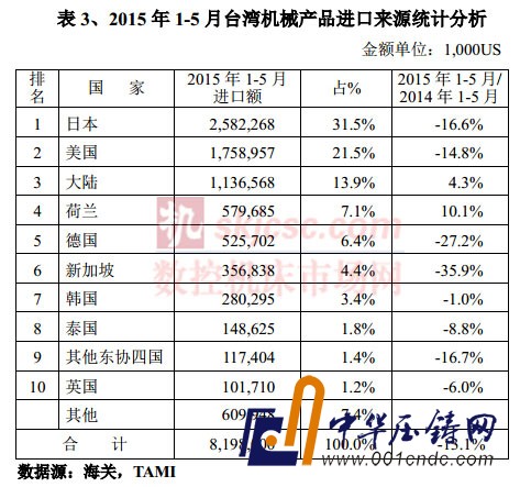 臺灣機(jī)械2015年1-5月進(jìn)口主要來源,日本排名第一位,進(jìn)口值25億8,226萬美元,占全部進(jìn)口31.5%,較上年同期負(fù)成長16.6%。第二是美國,進(jìn)口值17億5,895萬美元,占全部進(jìn)口21.5%,較上年同期負(fù)成長14.8%。第三是大陸,進(jìn)口值11億3,656萬美元,占全部進(jìn)口13.9%,較上年同期成長4.3%,詳如下表3。