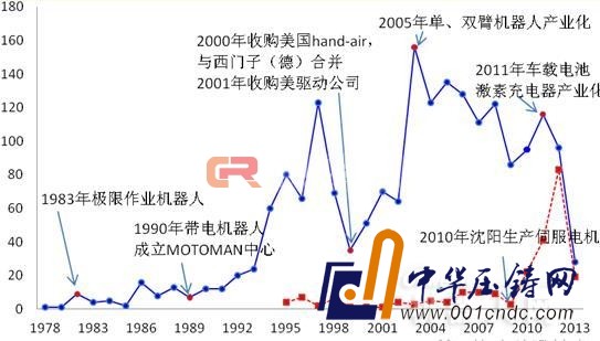 圖5安川電機的專利申請情況(注:藍色為全球專利申請 紅色為在華專利申請)