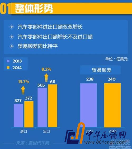 根據蓋世汽車網整理的中國汽車工業協會的數據,去年中國汽車零部件進出口貿易雙雙增長。中國各類汽車零部件去年累計出口創匯611.5億美元,比2013年565.3億美元增長了8.2%,主要出口國家是美國、日本、韓國、德國、英國等;進口總額為371.7億美元,同比提升13.7%,增速高于出口,主要向進口國為德國、日本、韓國、美國、法國等。