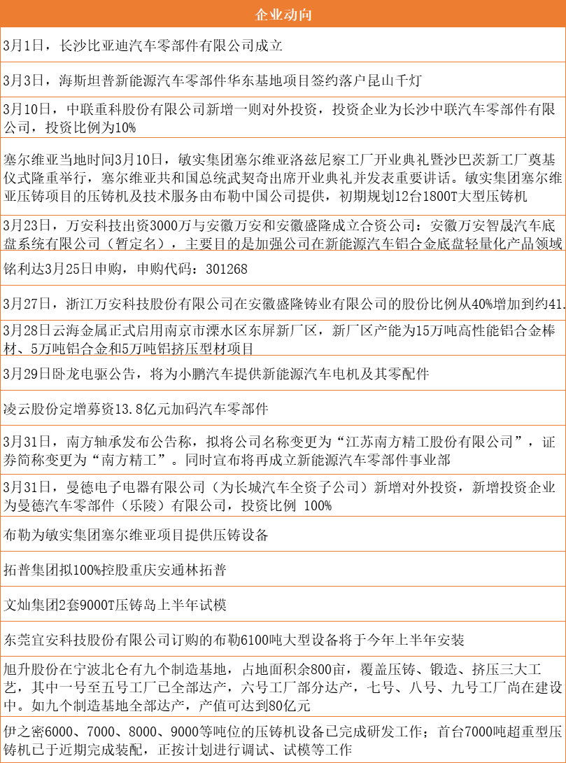 ? 3月不少企業(yè)在汽車零部件方向發(fā)力,其中,凌云股份定增募資13.8億元加碼汽車零部件,萬安科技出資3000萬與安徽萬安和安徽盛隆成立合資公司,旨在加強公司在新能源汽車鋁合金底盤輕量化產(chǎn)品領(lǐng)域研發(fā)和生產(chǎn)能力。