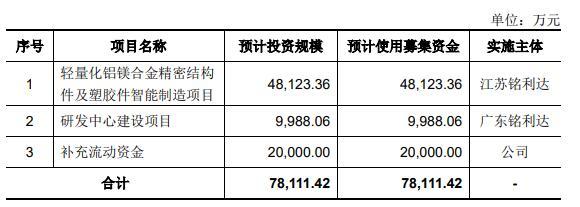 銘利達(dá)本次發(fā)行計(jì)劃募集資金7.81億元,重點(diǎn)投向“輕量化鋁鎂合金精密結(jié)構(gòu)件及塑膠件智能制造項(xiàng)目”和“研發(fā)中心建設(shè)項(xiàng)目”,圍繞主營業(yè)務(wù)進(jìn)一步延伸、拓展與加強(qiáng),賦能銘利達(dá)實(shí)現(xiàn)長期高質(zhì)量發(fā)展。