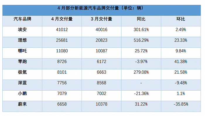 5月1日,4月新勢力車企汽車銷量市場交付榜出爐。廣汽埃安憑借新款車型表現突出,單月銷量突破4萬輛拿下榜首,理想、哪吒分別以25681輛、11080輛穩拿二、三名。然而,同為造車新勢力的蔚來汽車貌似在市場上表現越走越遠,銷量環比下降35.8%跌至第八名。