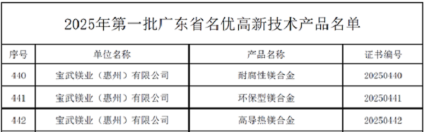 核心提示:近日,廣東省高新技術企業協會正式公布2025年第一批廣東省名優高新技術產品名單,寶武鎂業(002182)(惠州)有限公司(以下簡稱