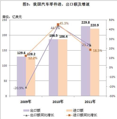 2011年汽車零件進口額約為汽車的一半,汽車零件貿(mào)易順差略增大